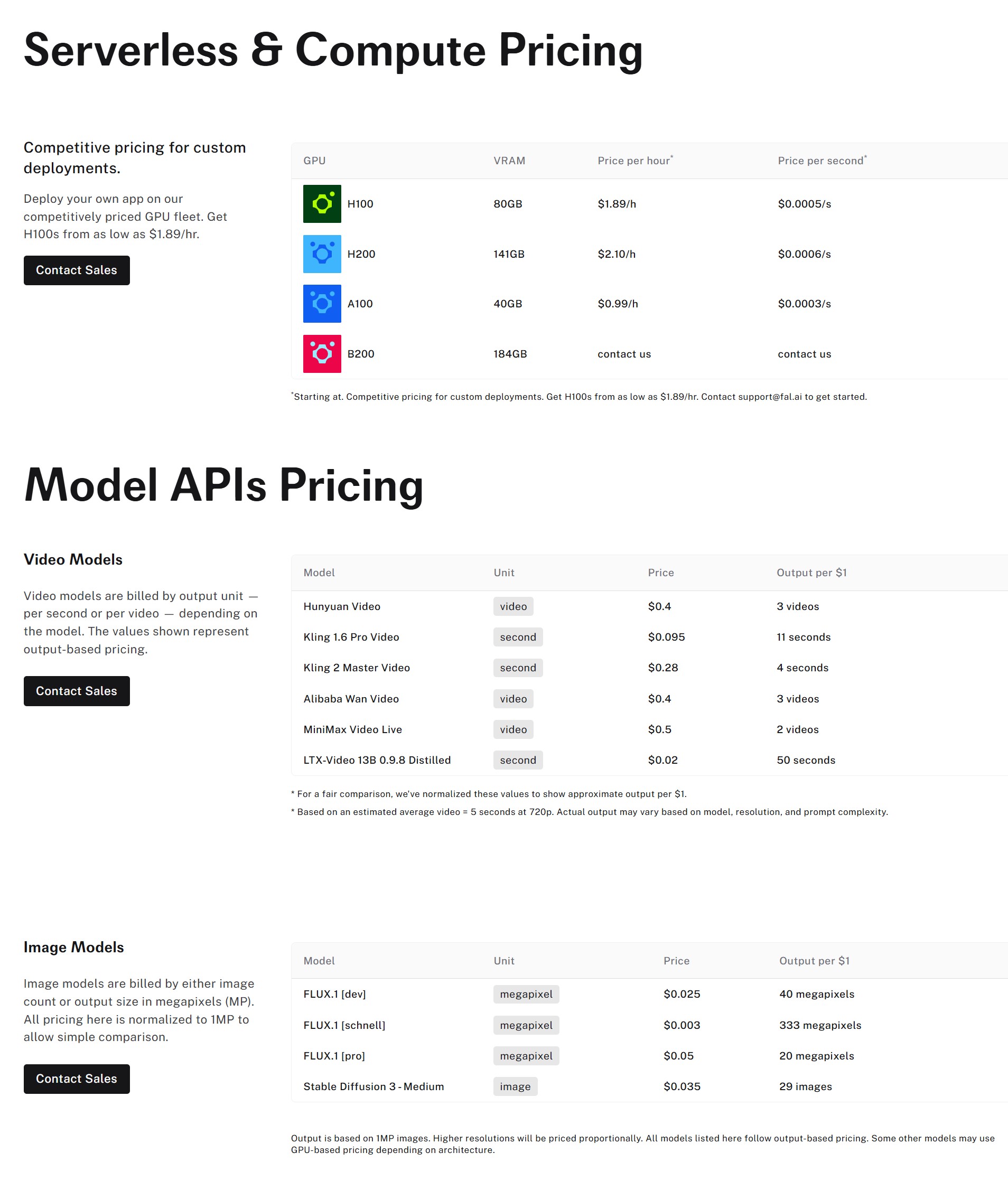 Options include per-output (serverless) or hourly GPU pricing (for more custom compute). Fal AI